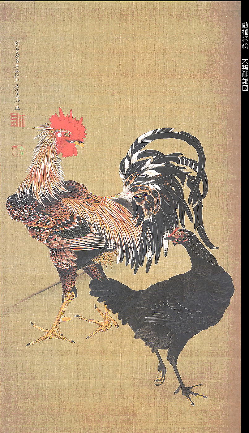 「大鶏雌雄図」。あえて、鶏だけを描いた絵で、すっと1本引いた土のラインがあるだけでかろうじて戸外と知れるものの、背景は何 も描かれていない。牡丹や芍薬や葡萄や、「余分なものは省いて描いてみました。」とでも言うよう絵である。見合う雄と雌の鶏二羽。 華やかな衣装をまとって誇らしげな雄鶏と、光沢のある黒一色の雌鶏のコケティッシュな姿振る舞い。恋の駆け引きのやりとりが、今 にも聞こえてきそうである。