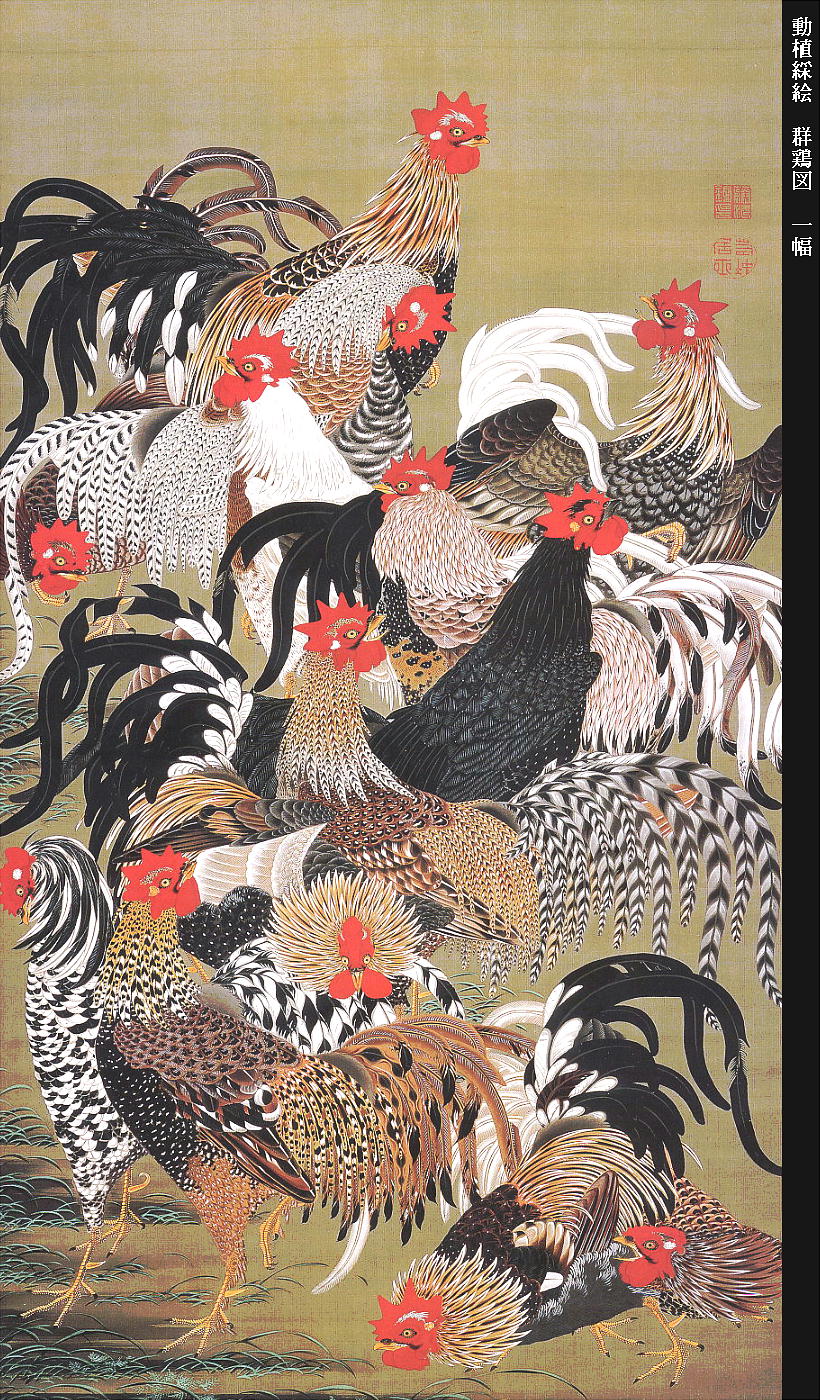 鶏を庭に放し飼いにして(鶏とは「庭鳥」が語源)、延々と観察し続けた若沖の「鶏・集大成」のような絵である。鮮やかな色彩