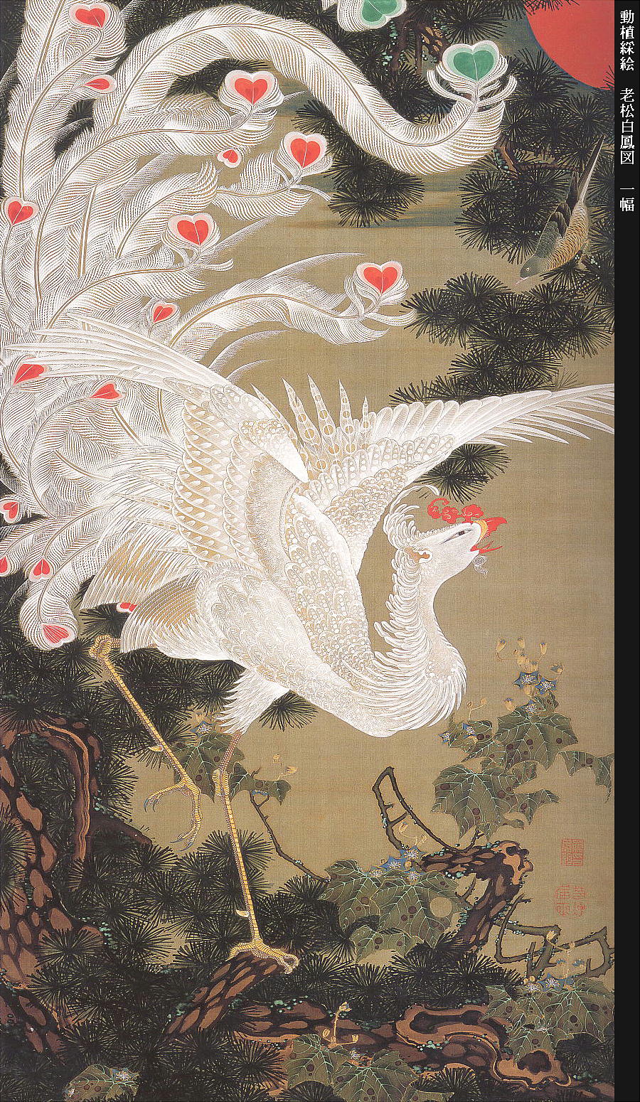 まさかあの時代にハートのマークがあったわけでもあるまいが、これまた色っぽい絵である。鳳凰の顔は、北新地のバーによく似た女 がいるような気も。想像上の鳥である鳳凰をここまで艶やかに描くのは何か意図があるのだろうか。頁の孔雀もそうだが、実際には あんな真っ白の孔雀はいないし、鳳凰も金色ならいざしらず、純白に金である。若沖は白に格別の思い入れでもあったのだろうか。 画面の右下には松に絡む桐(?)が描かれ、右上には真っ赤な日輪と不如帰のような鳥が描かれているが、これもよく分からない。お そらくは日輪にむかって羽ばたく鳳凰という構図なのだろうが、それなら日輪はもっと大きくてもいいような気もする。