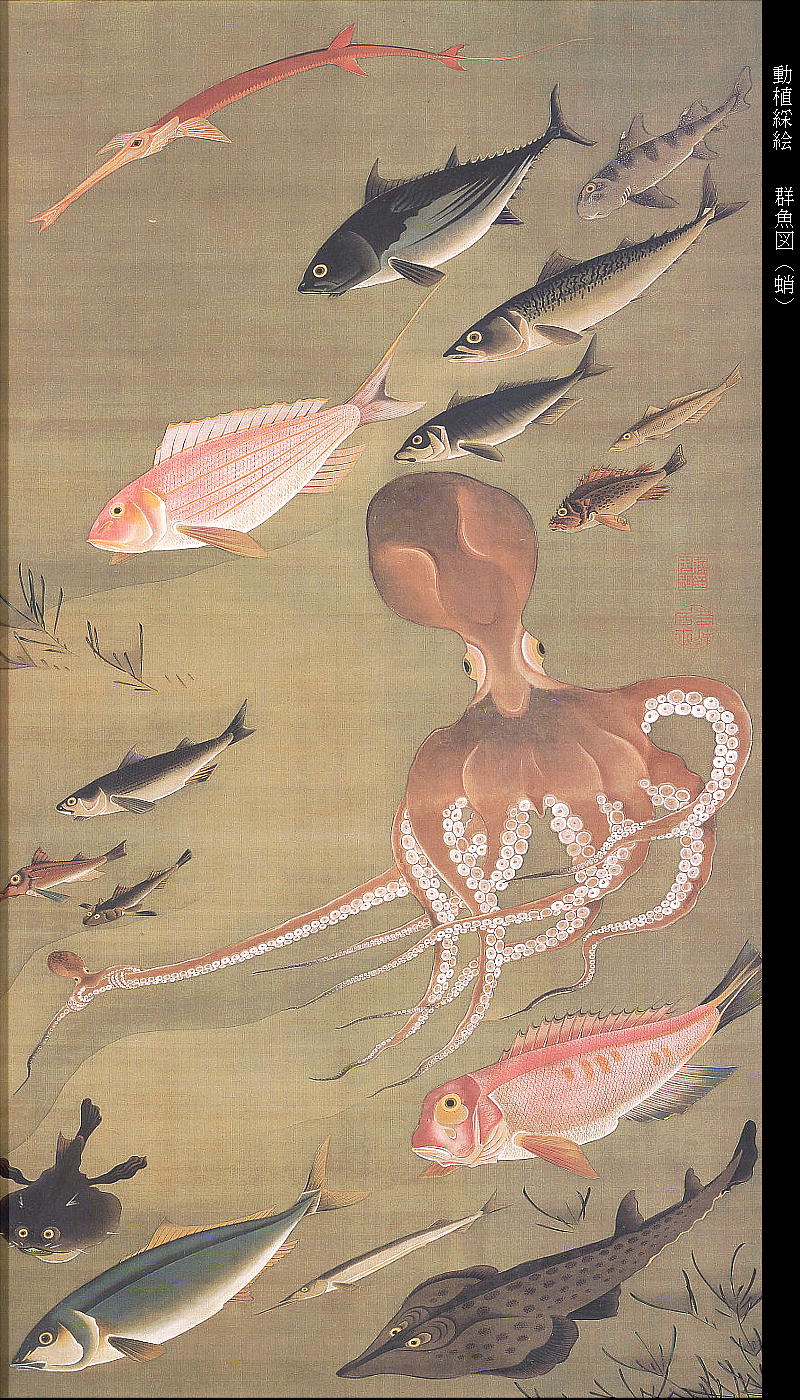 を込めたのではないか、と言われる。親蛸の足の先に子蛸がからみついているのがユーモラスでおかしい。若沖はおそらく、錦小路