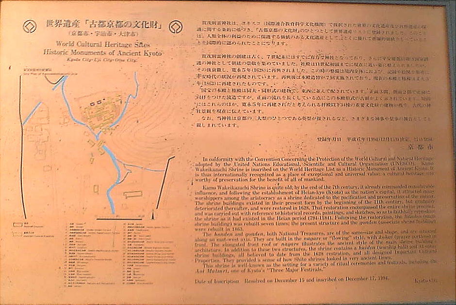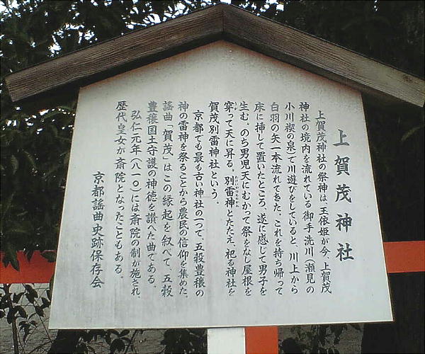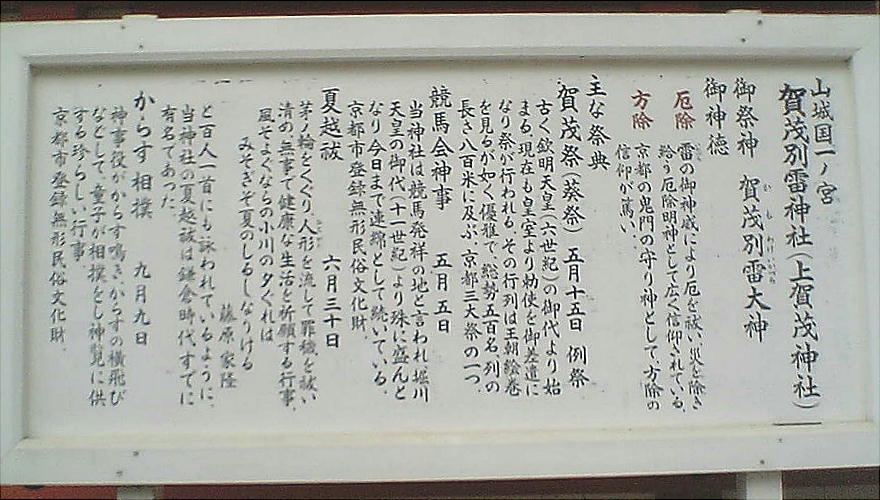 平安時代には皇城鎮護の守護神として尊ばれた。正式には賀茂別雷神社(かもわけいかづちじんじゃ) と言うが、通称「上賀茂神社」