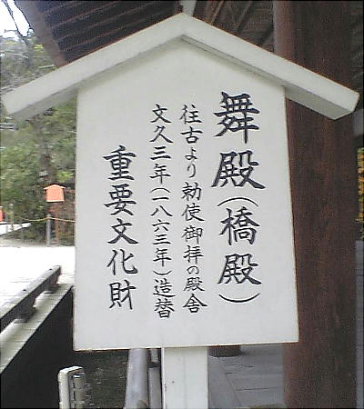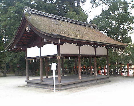 「細殿」の東側に「舞殿」が建っている。「舞殿」は、かつて勅使御拝の殿舎として使われていた。現在の建物は文久3年(1863年)に