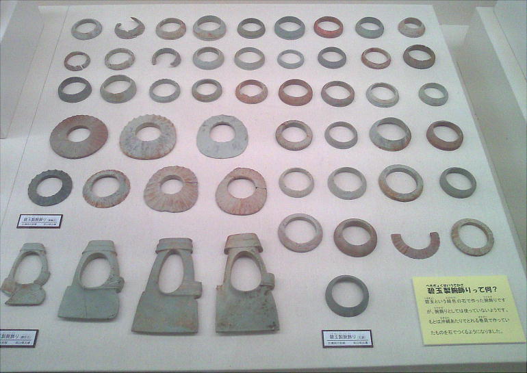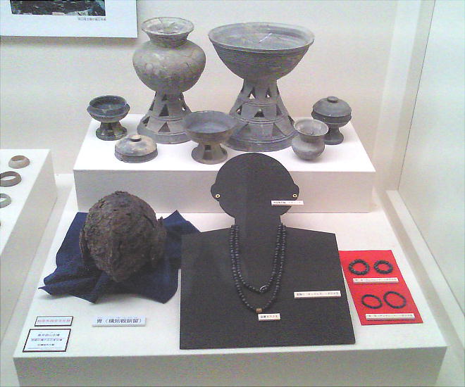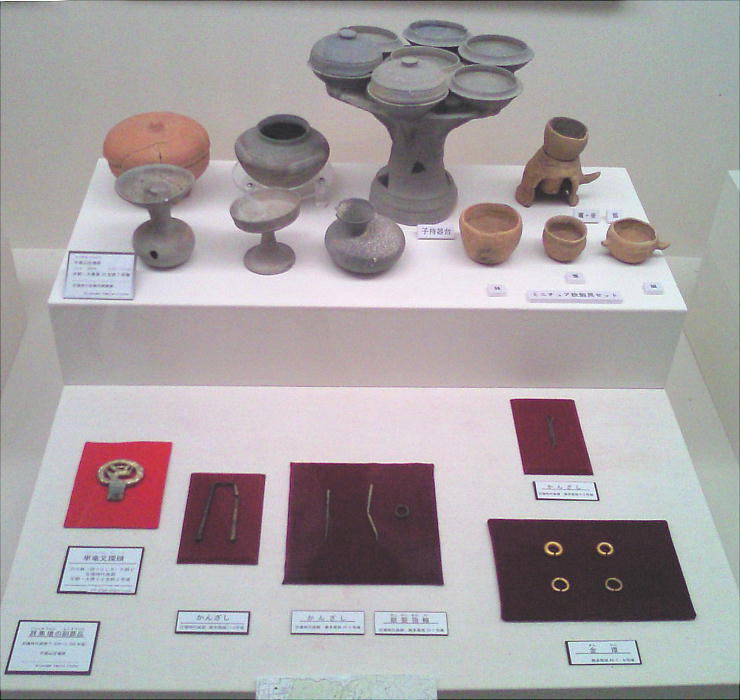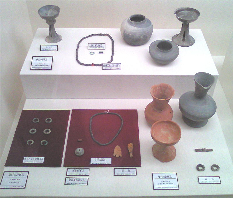 が、硬玉製の勾(まが)玉、碧玉製の管玉や丸玉、ガラス製の小玉、碧玉製の腕飾り形の宝器、鏡、銅製と鉄製の矢じり、鉄製の刀・