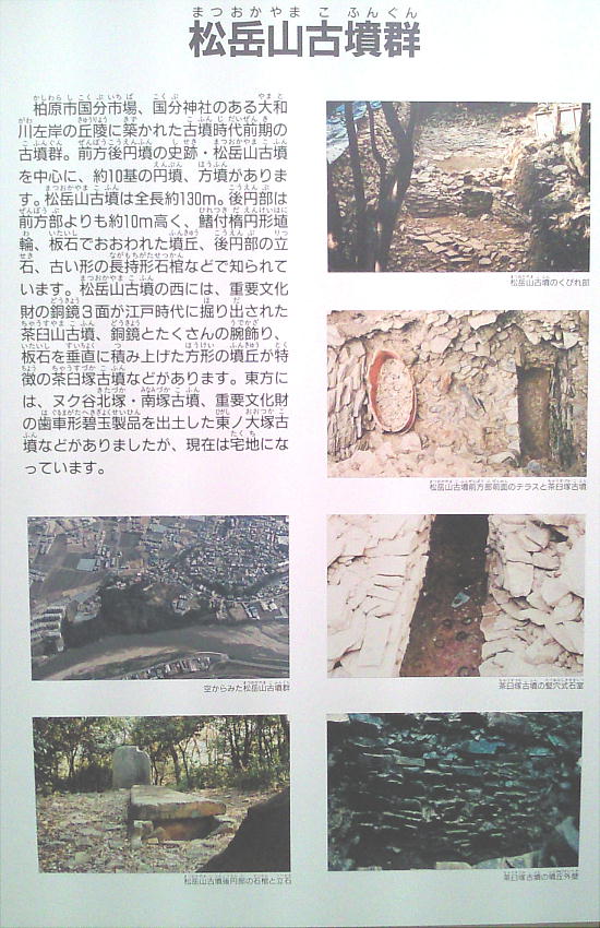 松岳山古墳は、前方後円墳で4世紀後半のものと推定されている。大和川を左岸から眼下にする丘陵地に築かれた120mを測る前期