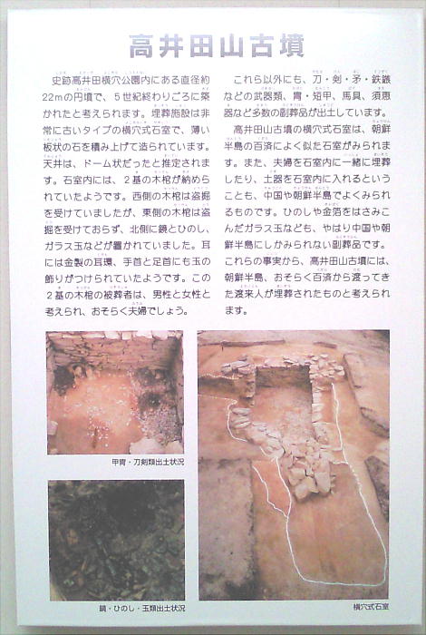 高井田山古墳は、薄い板石を積み上げて造られた横穴式石室をもつ古墳で、5世紀の終わり頃に造られたと考えられる。石室内からは、
