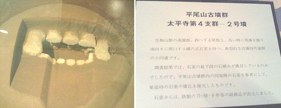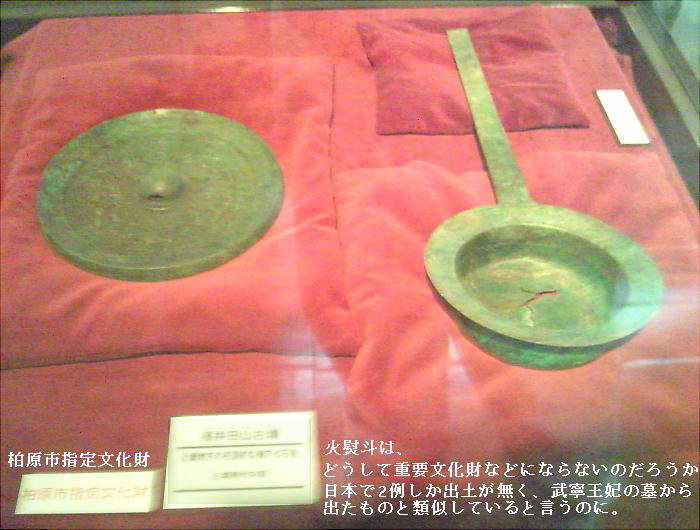 日本で2例目の発見となった火熨斗(古代のアイロン)や鏡、冑、甲のほかたくさんの武器や土器が出土している。この石室には透明な