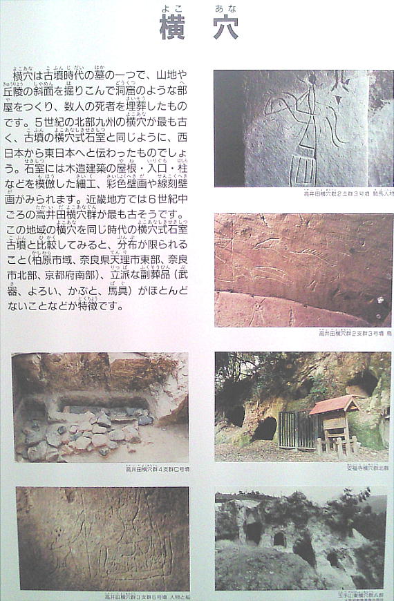 二上山の火山灰が積もってできた凝灰岩と呼ばれる岩盤に洞窟のような穴を掘り、 死者をほうむったもの。横穴からは、土器や武器、