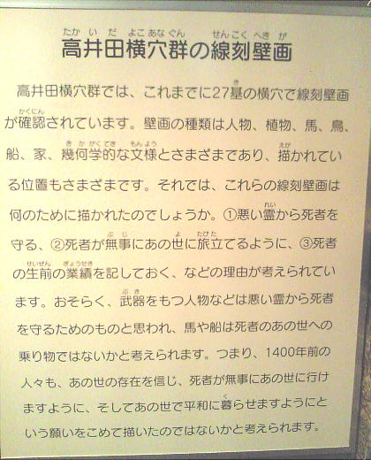 装身具などが発見されている。 また、人物、鳥、馬など様々な線刻壁画が描かれた横穴もあり、貴重な文化財である。
