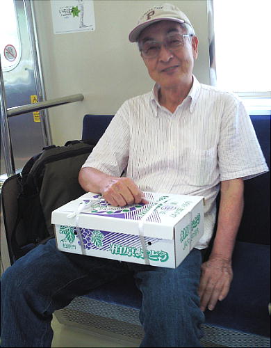 河内さんが持っているのは「柏原ぶどう」一箱である。種類は忘れたが、小さな種なしぶどうで甘かった。買ったものではない。これ