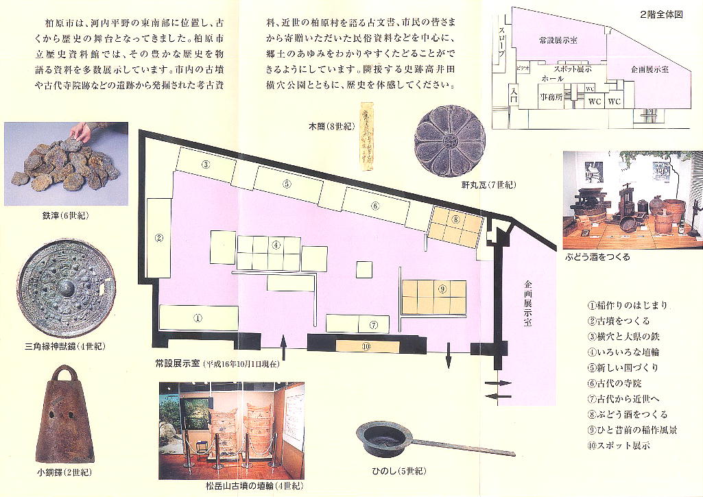 玉手山、松岳山、平尾山古墳群など柏原市内からの出土品を展示している。稲作やぶどう酒造り展示など、市民から提供された民俗資
