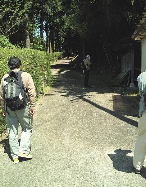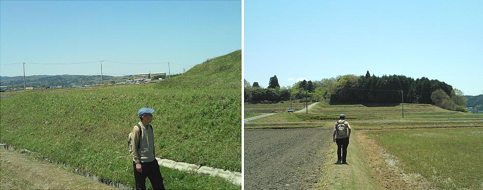 貴人塚古墳を降りてきて(上左)、滝川氏城跡へ向かう(上右)栗本さん、上右の、前方に見えている森が桜町中将城跡のようである。