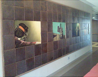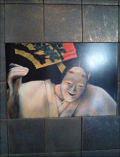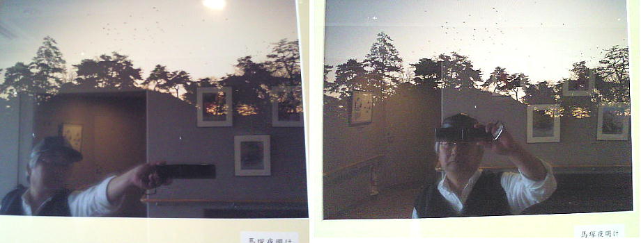 廊下の展示物や、壁に埋め込まれた能タイルを写しているのだが、自分ばかりが写っている。これは午塚古墳の夕焼けを撮っているつもり。
