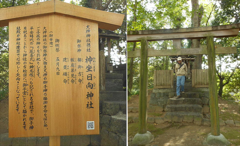 平等寺を出て三輪神社の方へ少し行くと、左手に延喜式にも記載がある「日向神社」がある。延喜式では「日向王子」となっている。