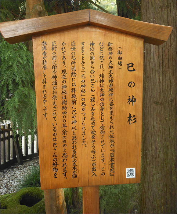 巳の神杉崇神天皇7年(紀元前91年)に天皇が物部連の祖伊香色雄(いかがしこを)に命じ、三輪氏の祖である大田田根子を祭祀主とし
