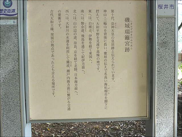 第10代崇神天皇の宮殿があった所とされている。初代神武天皇から欠史八代の、9代開化天皇までは実在した天皇ではない、という