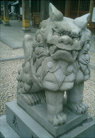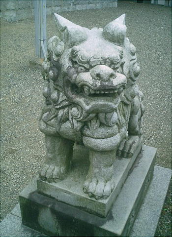 ここの狛犬は、犬と猫を合わせたような表情をしている。
