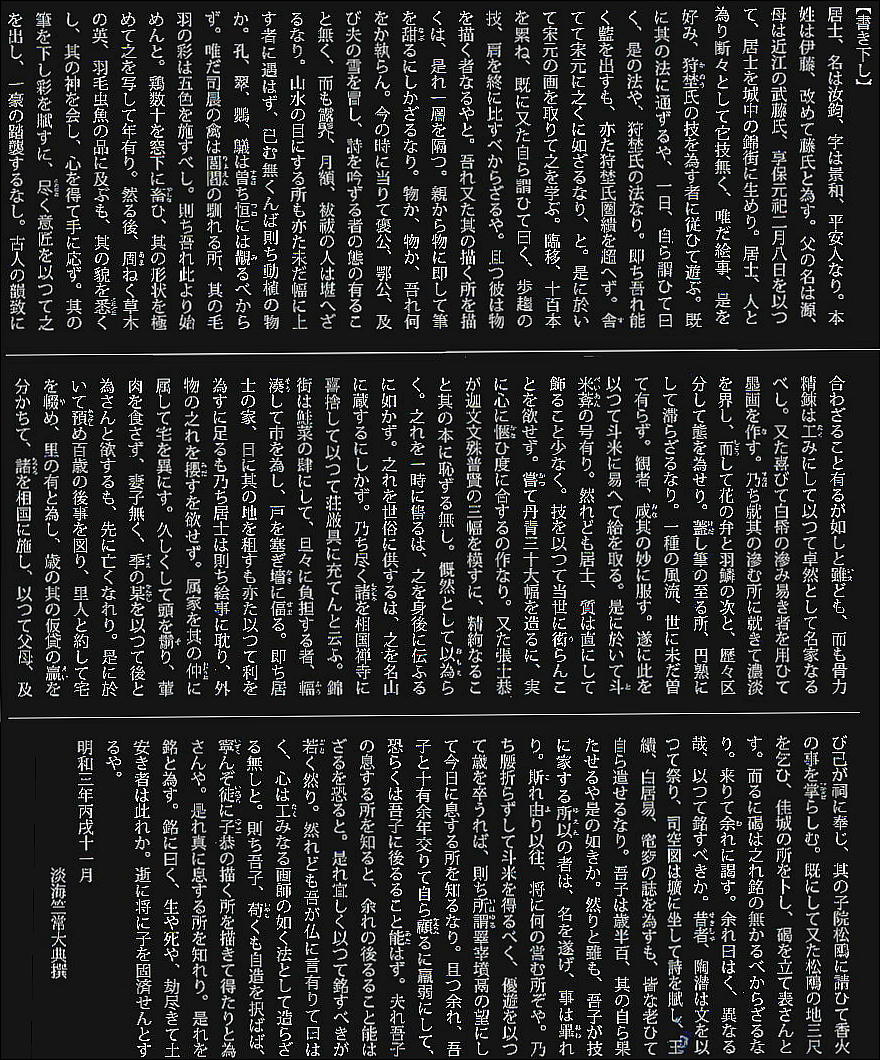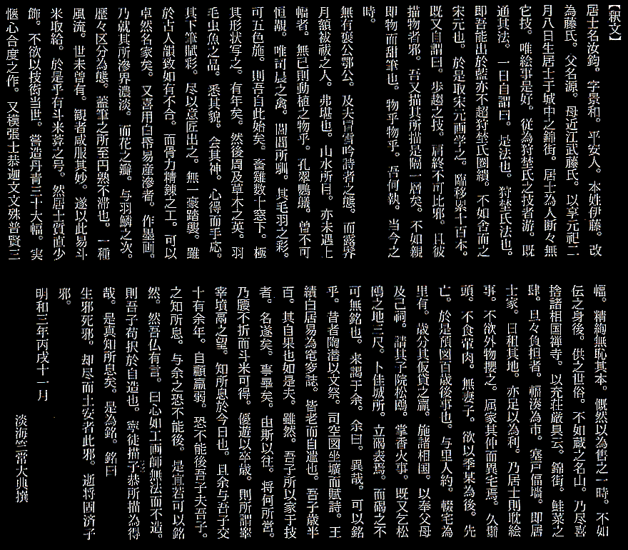 とう大典も承知してこの「釈文」を書いた。この「若沖寿塔銘」は、若沖の生涯を知る上での根本資料となっており、特に後