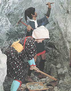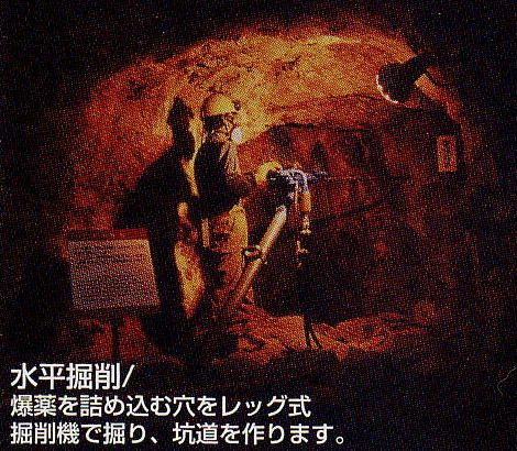 その頃の採鉱は手掘りで、数本のノミと金槌で鉱脈に穴を穿ち、火薬を装填して爆破し、ツルハシで掘り起こしていた。鉱