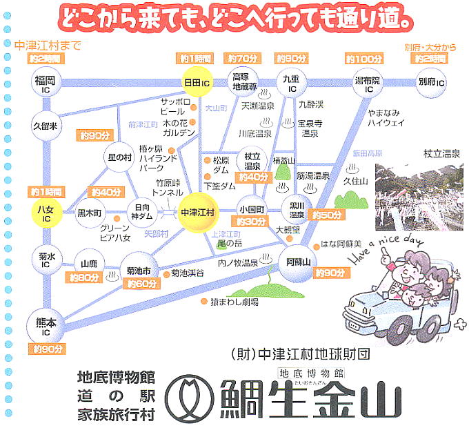 鯛生金山も今は閉山しているが、「道の駅鯛生金山」として復活しており、周辺は鯛生家族旅行村となっている。キャンプ