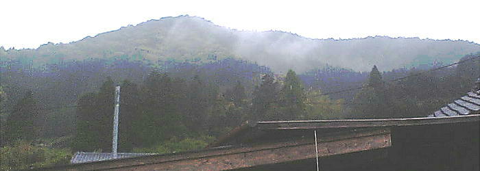 下は実家の庭から見た、我が家の雑木林山。朝からの雨がやっと上がっていく。子供時代はあの山の中は我々の遊園地だった。