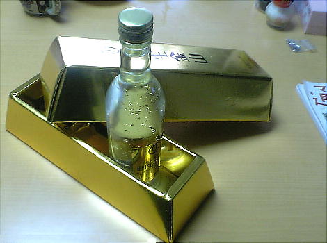 実家の弟へ土産に買った、金粉入り麦焼酎「鯛生金山」。5合で1800円!めちゃ高い。