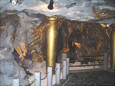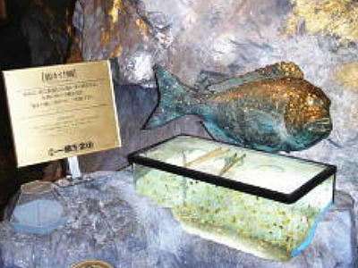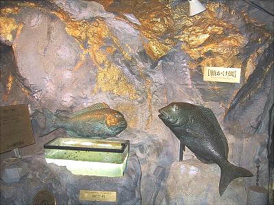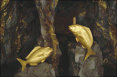 純金製の鯛を2匹、金箔で光り輝く側面で取り囲んだ黄金の洞窟。雌(70cm)雄(80cm)合わせて50kg、純金の黄金