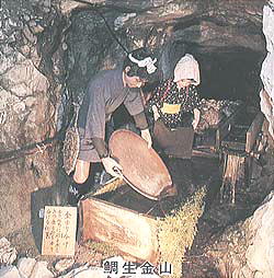 深い坑内には、切り梯子という丸太に段々を刻みつけた一本の梯子で上り下りする。選鉱場では選鉱夫が鉱石を選別し、金