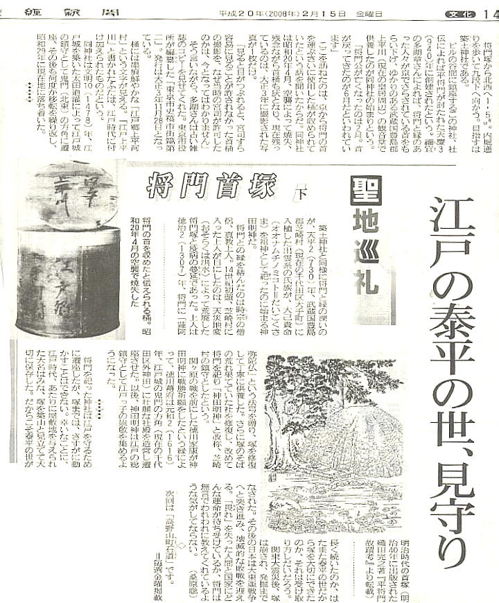 (1)築土神社は940年(天慶3年)6月、関東平定後、藤原秀郷らの手で討たれ京都にさらされた平将門公の首を首桶に納め密かに