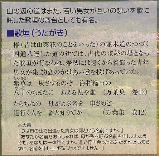 商業拠点として栄えた海石榴市は、多くの人が集まる場としての機能ももっていた。その一つに歌垣(うたがき)がある。男女