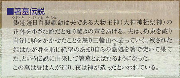 日本書紀には「昼は人が造り、夜は神が造った」との記述も残る。崇神天皇十年の条に、倭迹迹日百襲姫命が死んだので大市に葬り、