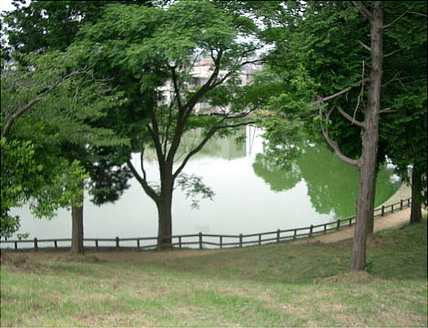 は北側の溜池だけで、これは後世拡張されている。東側・南側は埋め立てられているが、西側は不明である。前方部の周辺では過去