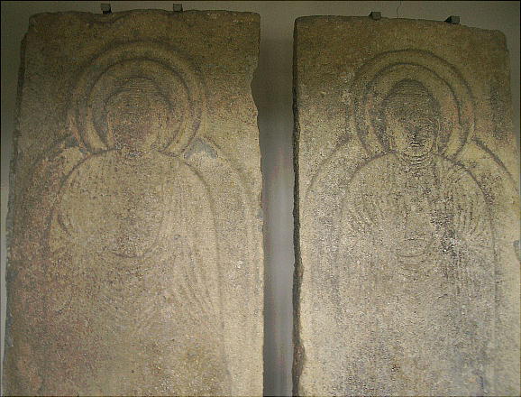 1.お堂の中に石仏(重文)二体がある。高さ2.2m板石に立像が浮き彫りにしてある。