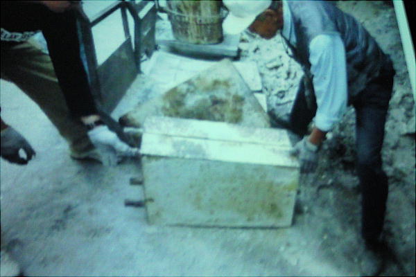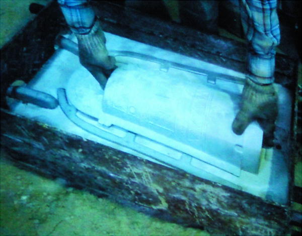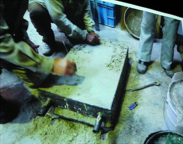 型枠の中に鋳型砂を入れ、銅鐸を置く。上からも砂をかぶせ固める。