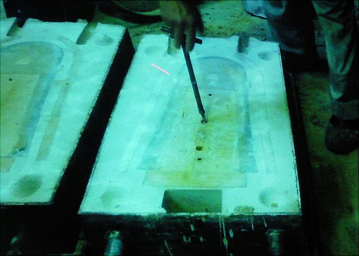 鋳型を開ける。上下に開けられるよう、鋳型には取っ手が付いている。