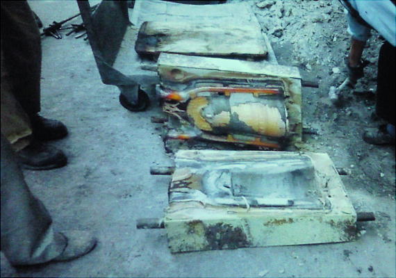 出来上がった銅鐸(真ん中)。これからバリ(廻りの鋳型くず)を切りとって磨けば、立派な銅鐸が出現する。