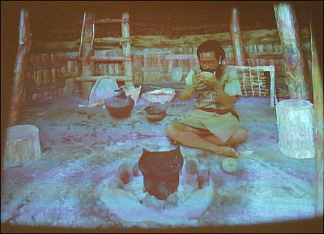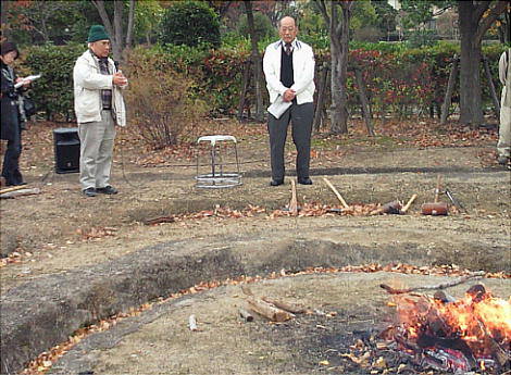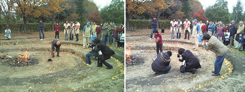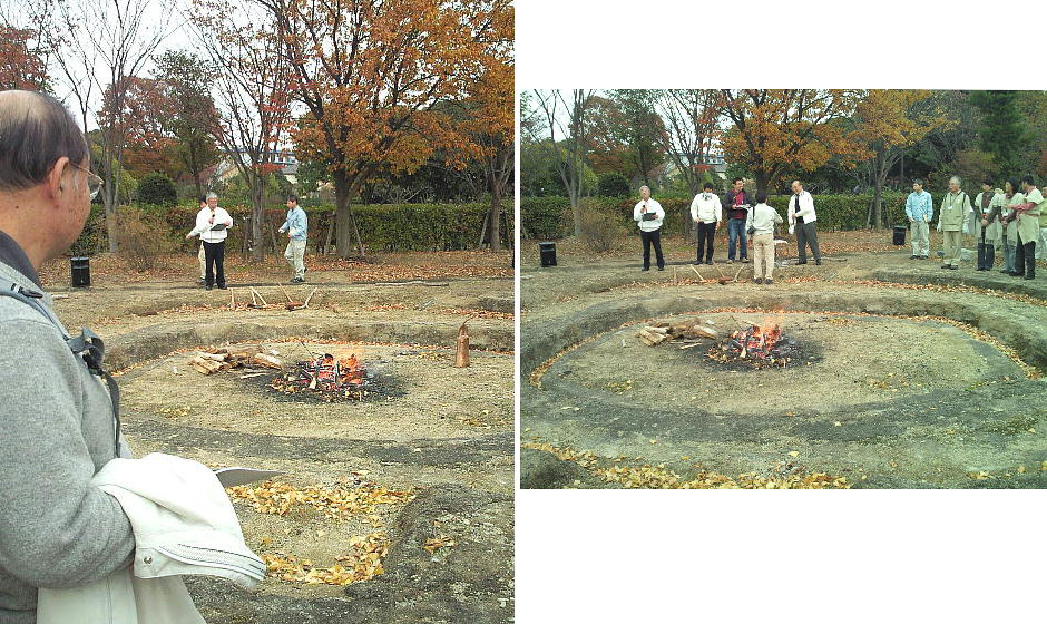 弥生時代の大中遺跡、竪穴式住居跡が実験会場である。既にたき火が燃えている。こんな火で銅鐸を燃やすのか。何かちょぼい。