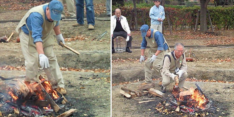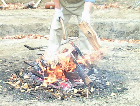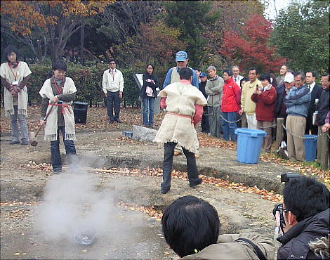 希望者や、考古学者(上右貫頭着のグループ)の皆さんが割ろうとするが、「ほら、これだけ」(下左)。それならと火の中へ。