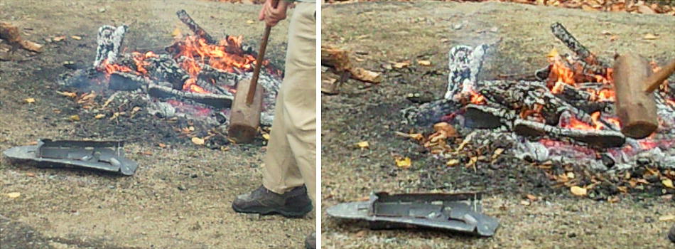 熱した銅鐸に冷水を浴びせ、それから同じように叩いてみるが結果は同じ。少しへこむだけ(下右)。
