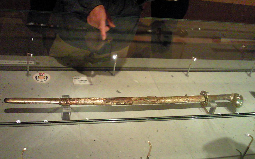 石棺の上にまで刀が乗っているし、その刀はまるで、藤の木古墳からの刀にもひけを取らないような立派さだ(下)。
