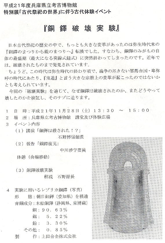 ●兵庫県考古博物館にて銅鐸破壊実験に参加。 (以下青字は、オモイカネさんからのmailです。)