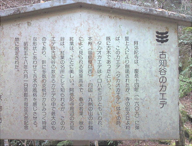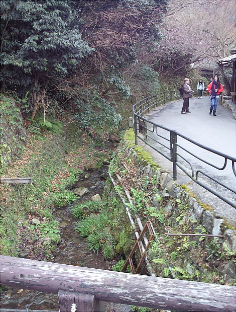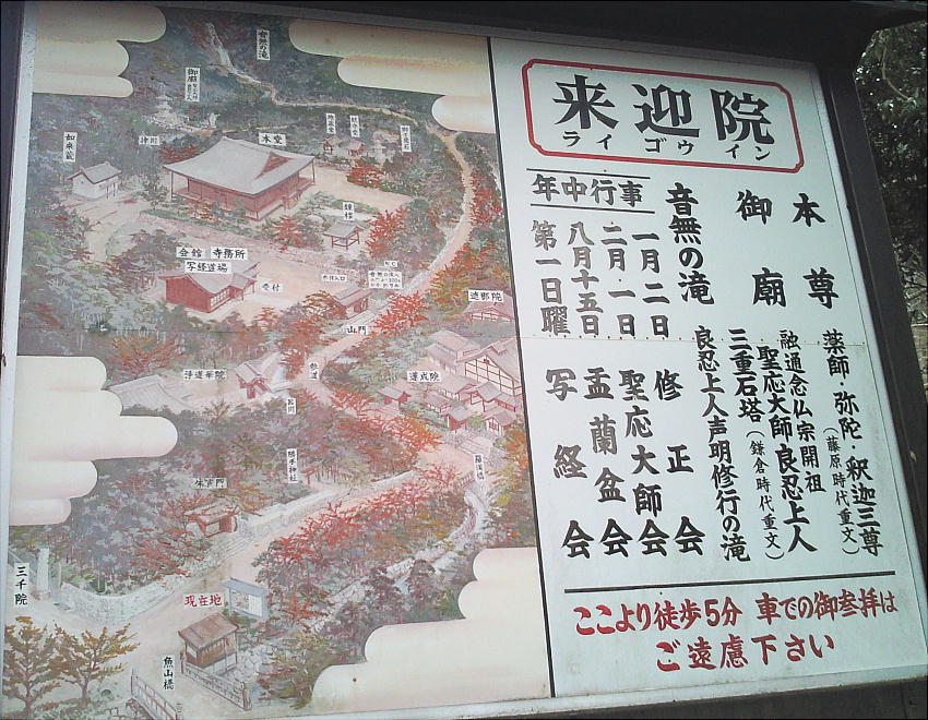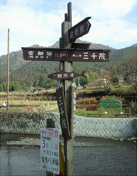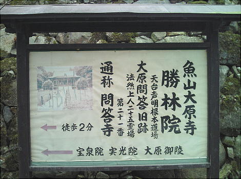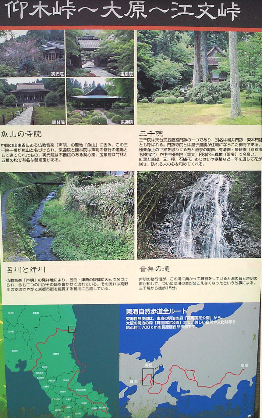 い案内看板が出ている。三千院への参道脇には山の水を集めた沢が音をたてて下り、木々の緑とそのせせらぎが織りなす爽快な感覚は