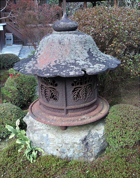 豊臣秀吉が寄進したという鉄製の雪見灯籠。きっちり桐の家紋が入っている。