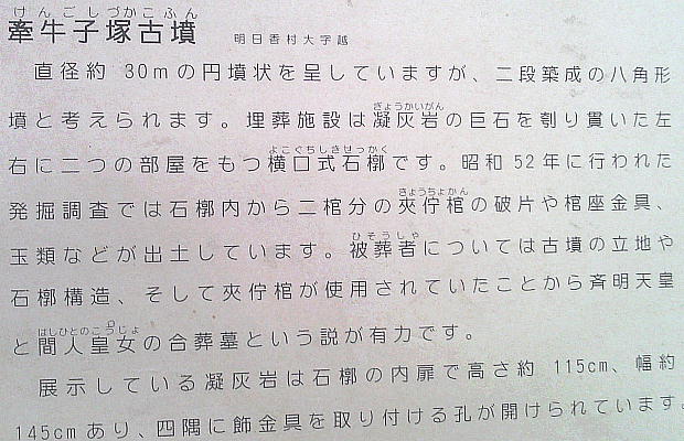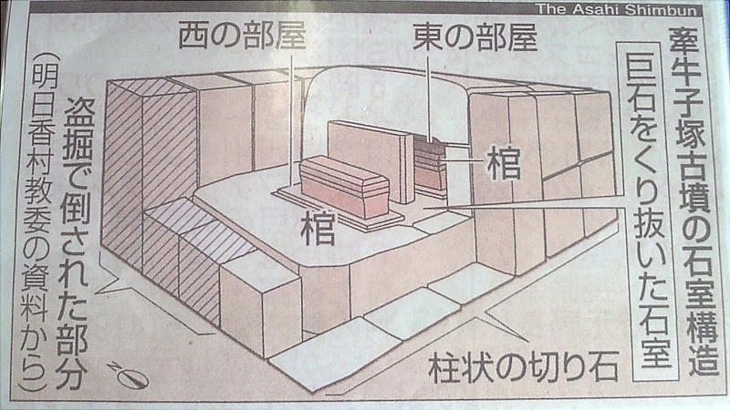 明した。石室の規模はこの時期としては最大規模で、渡来系氏族の東漢(やまとのあや)氏の墓との見方が有力である。(*)