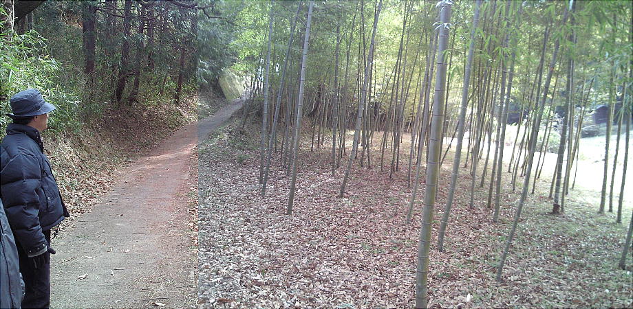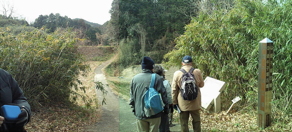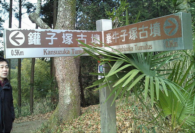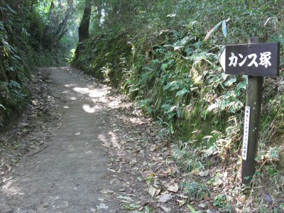 牽牛子古墳を廻って尾根づたいに遊歩道を進むと、道が二股に分かれ、「カンス塚古墳」と書かれた標識が立っている。標識に従っ