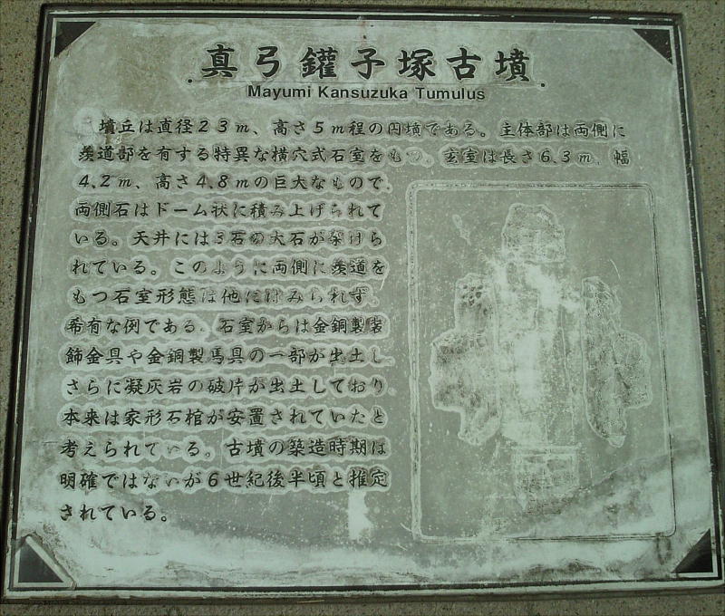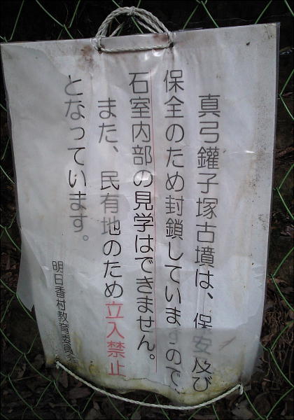 しかし残念な事に、無情な案内看板があって、「真弓鑵子塚古墳は、保安及び保全のため現在封鎖されていますので、石室内部の見