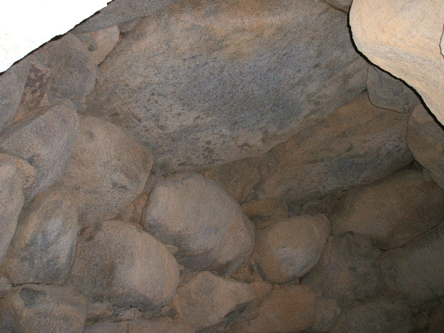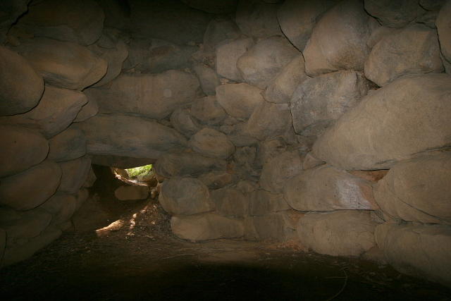 内部は石舞台古墳よりひろびろとした感じで、しかも石壁の上部は自然石がアーチ状に積まれている。さらに、光が漏れていると思