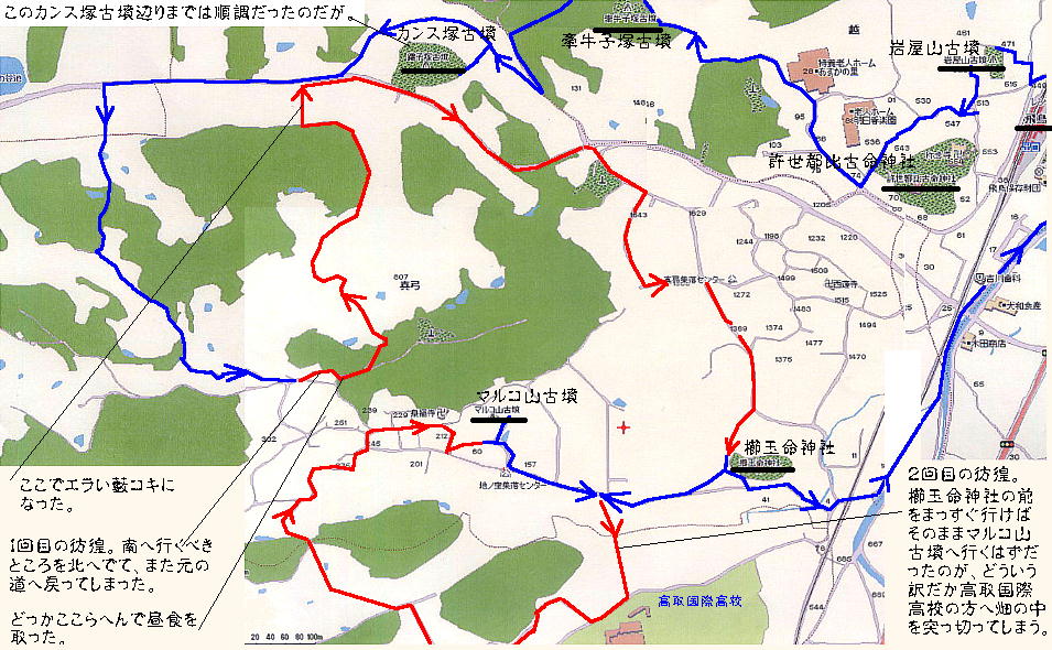上の写真が2回目の彷徨。高取国際高校のほうへ畑の中を突っ切っている。