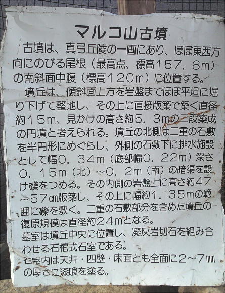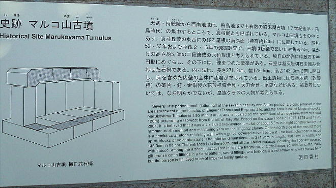 考えられていた。現在は史跡整備により築造当時の姿に復元されている。マルコ山古墳は過去の調査で高松塚古墳やキトラ古墳と同