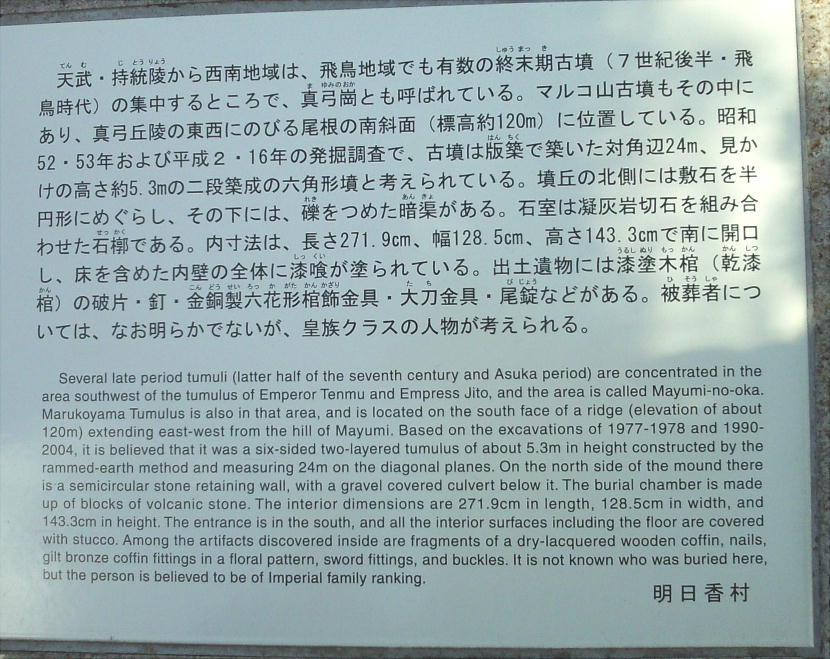 マルコ山古墳は、明日香村大字真弓に所在する横口式石槨を有した直径約24mの二段築成の六角形墳である。以前は円墳であろうと
