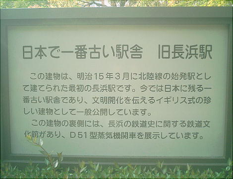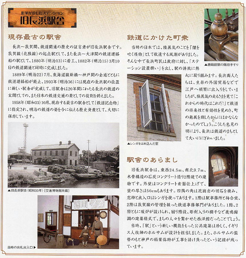 旧長浜駅舎は明治時代の建物で、現存する日本最古の駅舎である初代長浜駅舎をそのまま保存している。長浜鉄道文化館では北陸本